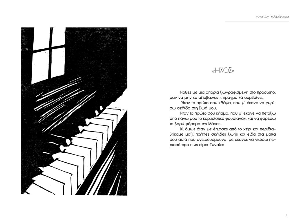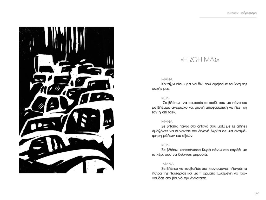 Πρόκειται για έναν “ποιητικό” διάλογο ανάμεσα σε δυο γυναίκες, μιας μάνας και μιας κόρης. Δυο μονόλογοι εμπλέκονται κι ένας διάλογος δημιουργείται. Δυο γυναίκες μονολογούν «συνομιλώντας». Ένα είδος εξομολόγησης, μια απολογία της μιας γενιάς στην άλλη, ένας εσωτερικός προβληματισμός,ένας επαναπροσδιορισμός της ύπαρξής τους και της σχέσης τους. Τα χαρακτικά ανήκουν στην ΄Ελενα Παπαδημητρίου.