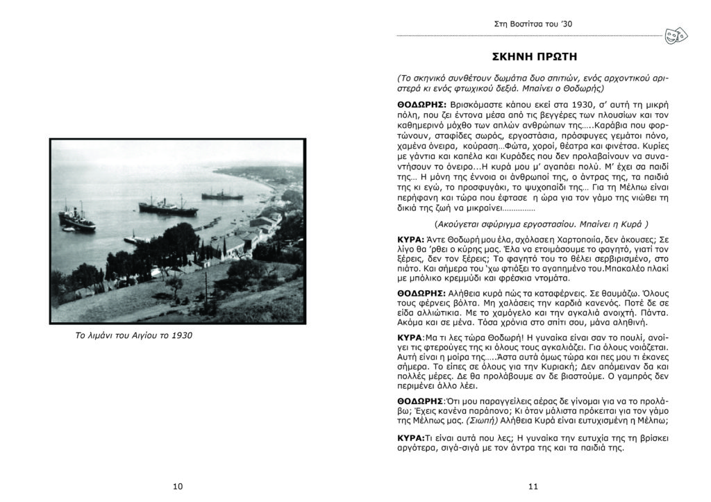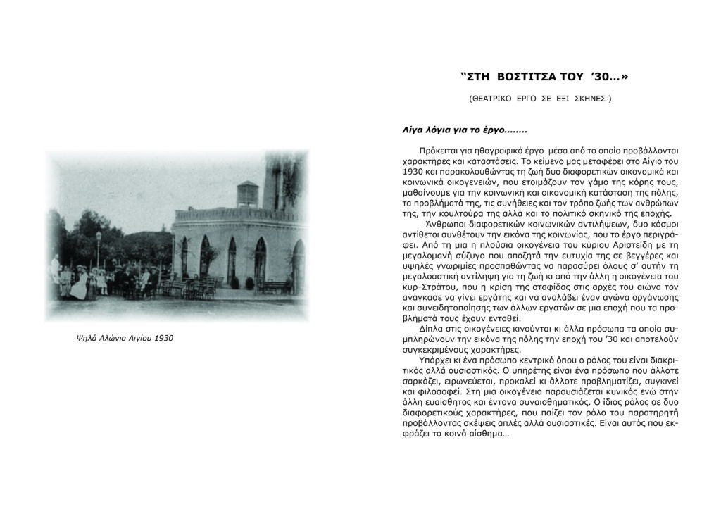 Το θεατρικό έργο «Στη Βοστίτσα του ‘30» είναι ένα ηθογραφικό έργο που αναφέρεται στο Αίγιο της εποχής του μεσοπολέμου. Στην εποχή που το Αίγιο ζούσε έντονα μέσα από τις βεγγέρες των πλουσίων και τον καθημερινό μόχθο των απλών ανθρώπων του. Από τη μια καράβια που φορτώνουν, σταφίδες σωρός, εργοστάσια, πρόσφυγες γεμάτοι πόνο, χαμένα όνειρα, κούραση κι από την άλλη φώτα, χοροί, θέατρα και φινέτσα. Κι όλα αυτά σε μια εποχή που ο Βενιζέλος παλεύει να εκλεγεί, ο δικομματισμός οδηγεί σε αποσταθεροποίηση κι όλα προμηνύουν τη μεγάλη καταστροφή που θα έρθει με τον Β΄ Παγκόσμιο πόλεμο. Το έργο προβάλλει χαρακτήρες της εποχής του ’30 και μέσα από καθημερινά γεγονότα της ζωής των ηρώων της διαγράφεται η κοινωνική και οικονομική κατάσταση της πόλης, τα προβλήματά της, οι συνήθειες και ο τρόπος ζωής των ανθρώπων της, η κουλτούρα της αλλά και το πολιτικό σκηνικό της εποχής.