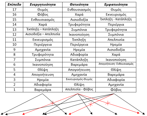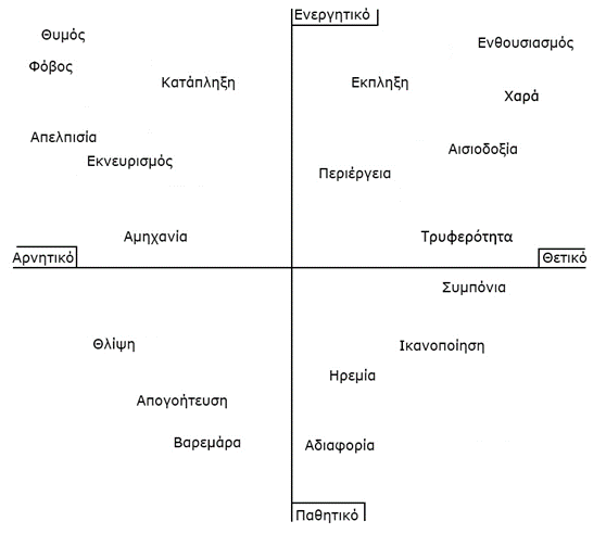 Η μεταβολή του συναισθηματικού περιεχομένου θα μπορούσε να μελετηθεί σε δύο άξονες : ενεργητικό – παθητικό, θετικό – αρνητικό, όπως συνηθίζεται σε ψυχολογικές μελέτες που σχετίζονται με τις μεταβολές του συναισθήματος .