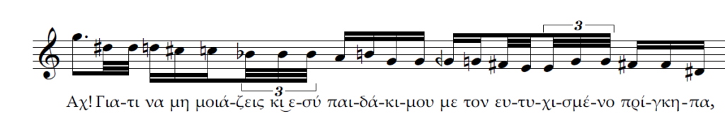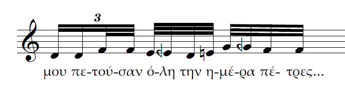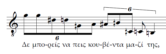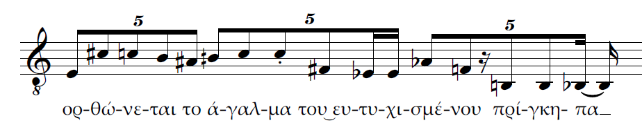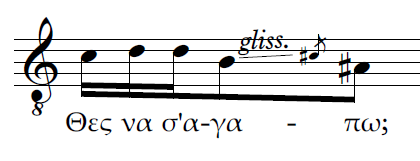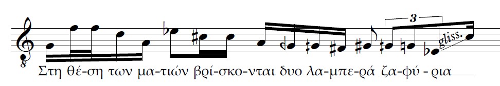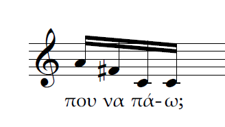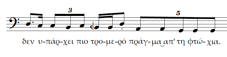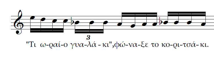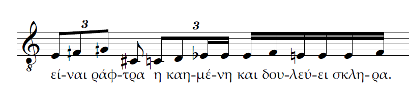 Β) Επίσης τρεις κινήσεις ταυτόχρονες. Η διαφορά με την περίπτωση Α είναι πως αντί για 2η μεγάλη έχουμε μία ακόμα 2η μικρή ανιούσα. Το μοντέλο μας θα χαρακτήριζε πάλι την ρητορική της σύνδεσης αυτής ως καταφατική και μάλλον ισχυρότερη από την προηγούμενη.