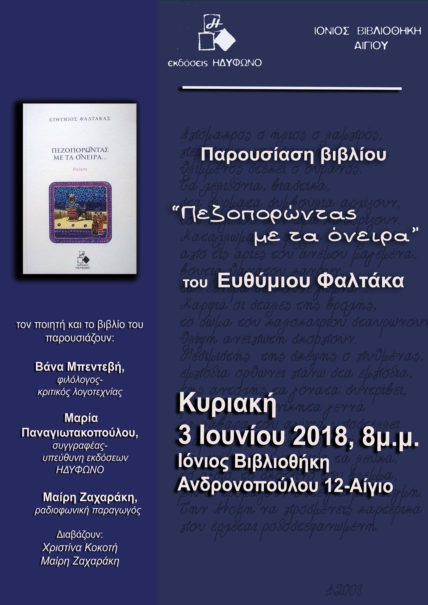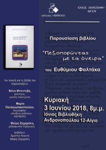 Την Κυριακή, 3 Ιουνίου, θα γίνει η παρουσίαση της νέας ποιητικής συλλογής του Ευθύμιου Φαλτάκα με τίτλο “Πεζοπορώντας με τα όνειρα” στην Ιόνιο Βιβλιοθήκη (Ανδρονοπούλου 12-Αίγιο).