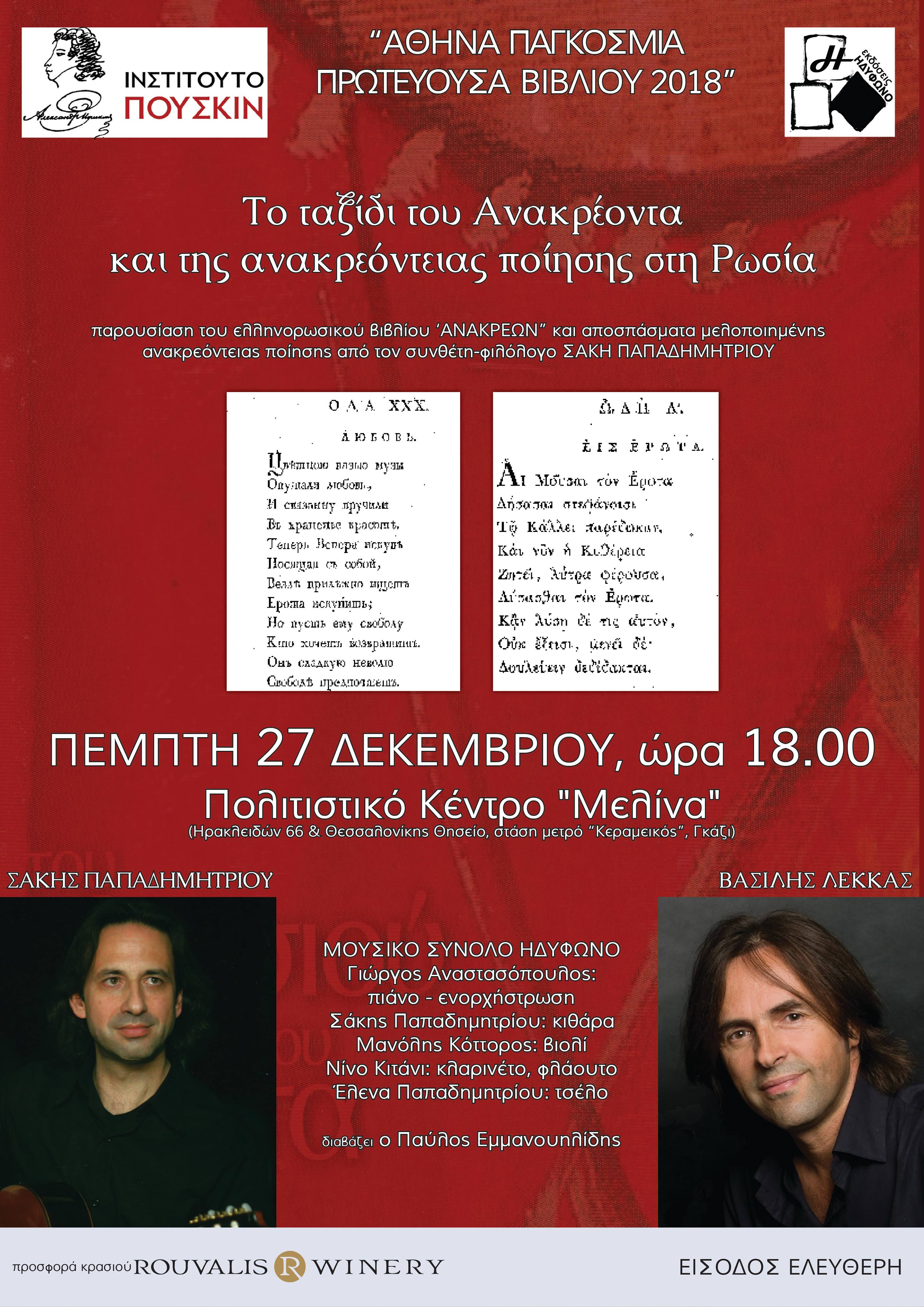 Το ΙΝΣΤΙΤΟΥΤΟ ΠΟΥΣΚΙΝ, στο πλαίσιο της διοργάνωσης “ΑΘΗΝΑ 2018 ΠΑΓΚΟΣΜΙΑ ΠΡΩΤΕΥΟΥΣΑ ΒΙΒΛΙΟΥ ” του ΔΗΜΟΥ ΑΘΗΝΑΙΩΝ ολοκληρώνοντας τη σειρά εκδηλώσεων «ΓΕΦΥΡΕΣ», παρουσιάζει σε συνεργασία με τις εκδόσεις ΗΔΥΦΩΝΟ μια βραδιά λόγου και μουσικής με θέμα «ΤΟ ΤΑΞΙΔΙ ΤΟΥ ΑΝΑΚΡΕΟΝΤΑ ΚΑΙ ΤΗΣ ΑΝΑΚΡΕΟΝΤΕΙΑΣ ΠΟΙΗΣΗΣ ΣΤΗ ΡΩΣΙΑ». Μια ωδή, που υμνεί το δικαίωμα του ανθρώπου στην ευτυχία, ταξιδεύει από την Αρχαία Ελλάδα στη Γαλλία, την Αγγλία και τη Ρωσία και ντύνει με μουσική τον εθνικό ύμνο των ΗΠΑ.