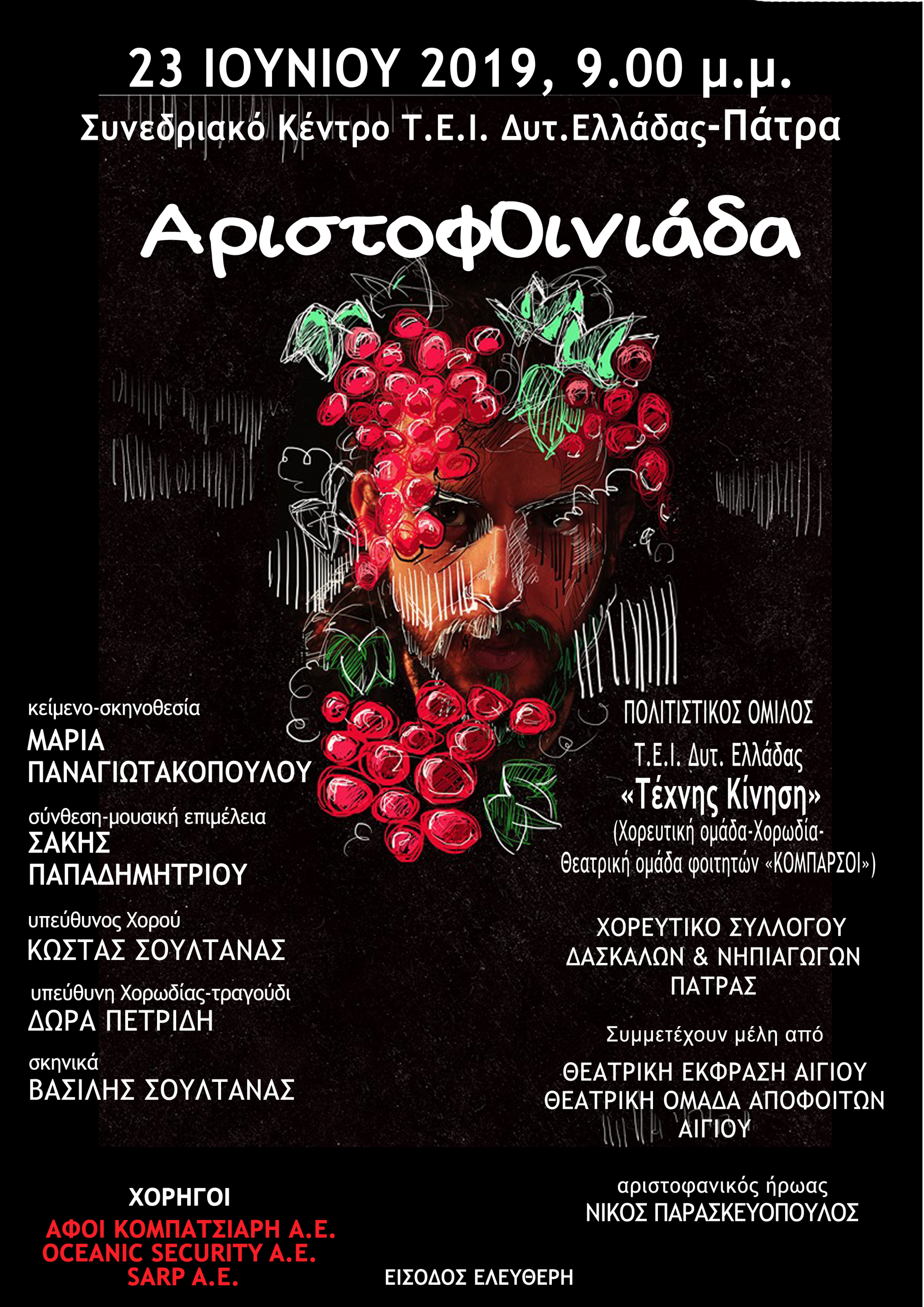 Mια μεγάλη μουσικοθεατρική-χορευτική παράσταση διοργανώνει  την Κυριακή 23 Ιουνίου στις 9μ.μ., ο Πολιτιστικός Όμιλος Τ.Ε.Ι. Δυτικής Ελλάδας «Τέχνης Κίνηση», στο Συνεδριακό Κέντρο του ΤΕΙ Δυτ. Ελλάδας στην Πάτρα. Πρόκειται για την παράσταση με τον χαρακτηριστικό τίτλο “ΑριστοφΟινιάδα” όπου ο λόγος του Αριστοφάνη για το κρασί, μέσα από τις κωμωδίες Αχαρνείς, Ιππείς, Λυσιστράτη και Εκκλησιάζουσες, εμπλέκεται με αρχαία λυρική ποίηση, αλλά και παραδοσιακά και σύγχρονα έντεχνα ελληνικά τραγούδια.