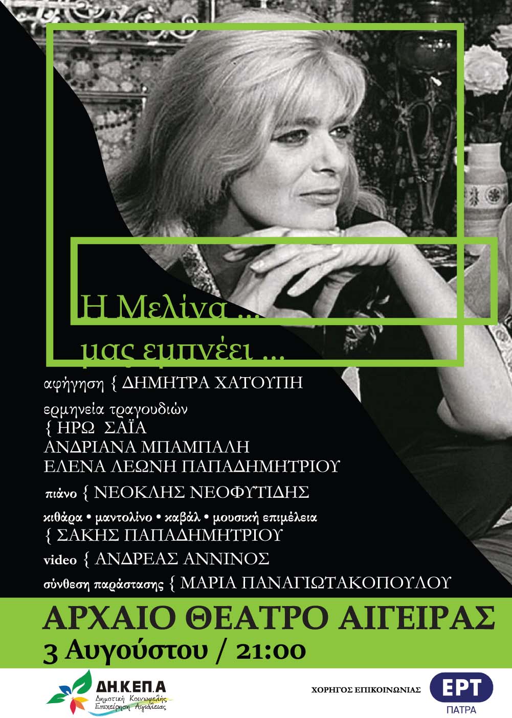 Στο αρχαίο θέατρο της Αιγείρας στις 3 Αυγούστου, στην πανσέληνο θα πραγματοποιηθεί η μουσική παράσταση «Η Μελίνα μας εμπνέει…». Μια ατμοσφαιρική παράσταση αφιερωμένη στη Μελίνα Μερκούρη μέσα από κείμενα δικά της για τη ζωή της, την καριέρα της ως ηθοποιού και ως πολιτικού, την αντιστασιακή της δράση στη χούντα αλλά και μέσα από τα τραγούδια της και τους σημαντικούς ρόλους που έχει ερμηνεύσει.