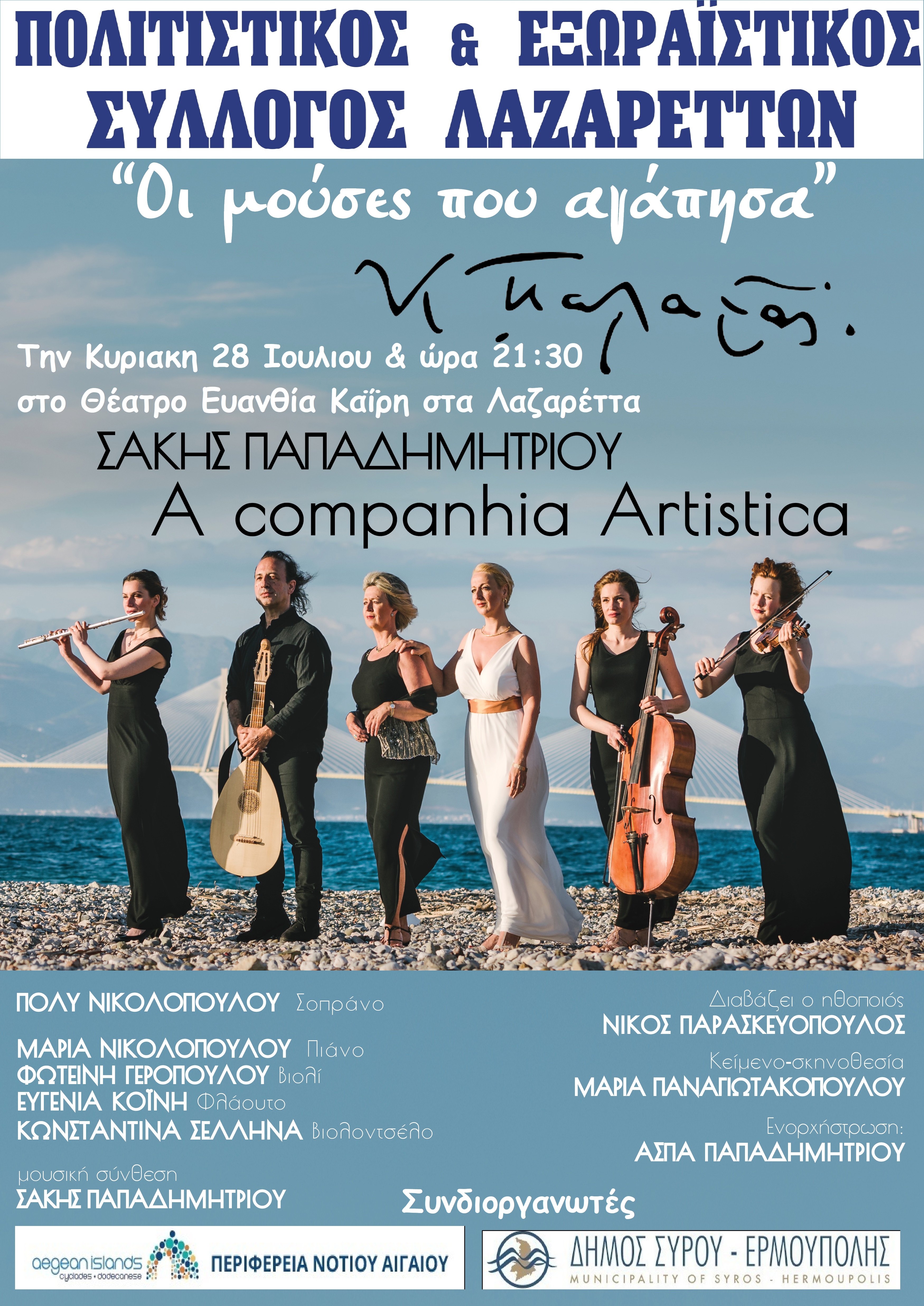 Η καινούργια συνθετική δουλειά του Σάκη Παπαδημητρίου πάνω στην ερωτική ποίηση του Κωστή Παλαμά γίνεται αφορμή και πρόκληση για  μια ιδιαίτερη συνεργασία  με το καταξιωμένο πατρινό γυναικείο μουσικό σύνολο A Companhia Artistica με υπεύθυνη την πιανίστα Μαρία Νικολοπούλου, ερμηνεύτρια τη σοπράνο Πόλυ Νικολοπούλου, τη Φωτεινή Γεροπούλου στο βιολί, την Ευγενία Κοΐνη στο  φλάουτο και την Κωνσταντίνα Σέλληνα στο βιολοντσέλο.
