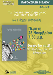 Οι εκδόσεις Ηδύφωνο σας προσκαλούν στην παρουσίαση του βιβλίου μικρών πεζών του Γιώργου Τσοπανάκη “Το πιθάρι της Πανδώρας και του Διογένη“, την Πέμπτη 28 Νοεμβρίου 2019 και ώρα 19:30 το απόγευμα, στο καφέ Φαεινόν, Kαλλιδρομίου 17, Εξάρχεια.