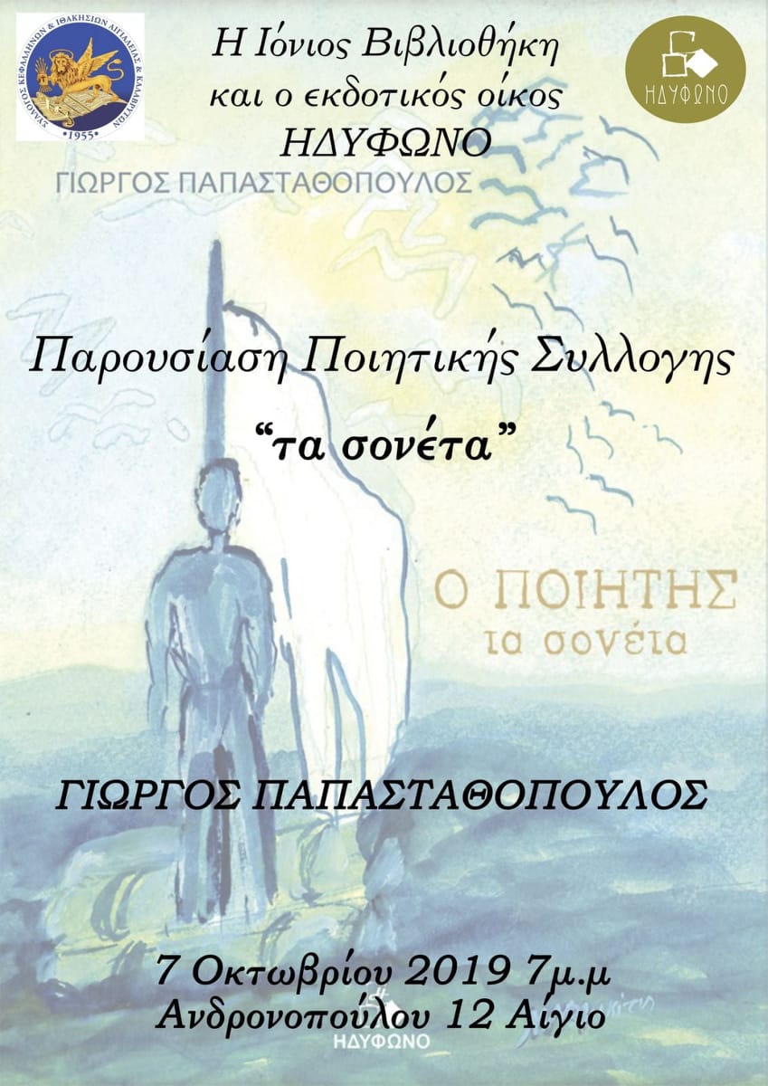 Η νέα ποιητική συλλογή με τίτλο «Ο ΠΟΙΗΤΗΣ-ΤΑ ΣΟΝΕΤΑ» του Γιώργου Παπασταθόπουλου  θα παρουσιαστεί τη Δευτέρα, 7 Οκτωβρίου στις 7 μ.μ. στην Ιόνιο Βιβλιοθήκη στο Αίγιο.