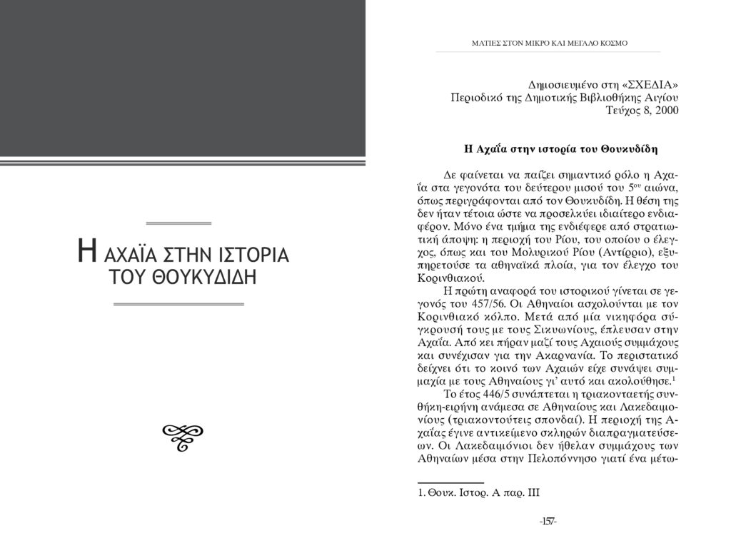 • Τέλος μια εργασία για την παρουσία της Αχαΐας στην ιστορία του Θουκυδίδη που δημοσιεύτηκε στο περιοδικό της Δημοτικής Βιβλιοθήκης -η ΣΧΕΔΙΑ- τεύχος 8 του 2000.